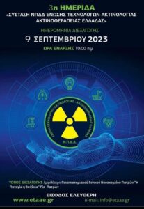 Το Σάββατο 9 Σεπτεμβρίου 2023 διοργανώθηκε η 3η ενημερωτική ημερίδα της Ε.Τ.Α.Α.Ε.-Ν.Π.Δ.Δ. στο αμφιθέατρο του Πανεπιστημιακού Γενικού Νοσοκομείου Πατρών « Παναγία η Βοήθεια» Ρίο στην Πάτρα, στην οποία συμμετείχαν συνάδελφοι ΠΕ και ΤΕ Τεχνολόγοι Ακτινολογίας Ακτινοθεραπείας από νοσοκομεία, κέντρα υγείας και ιδιωτικές δομές της Δυτικής Ελλάδας.